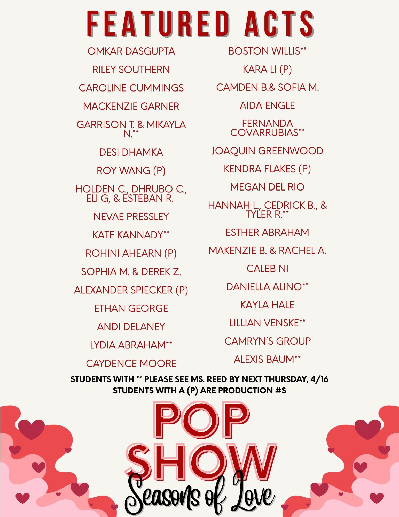 we had over 75 people/groups audition and could only select 34 acts. We sincerely appreciate your preparation for pop show auditions.